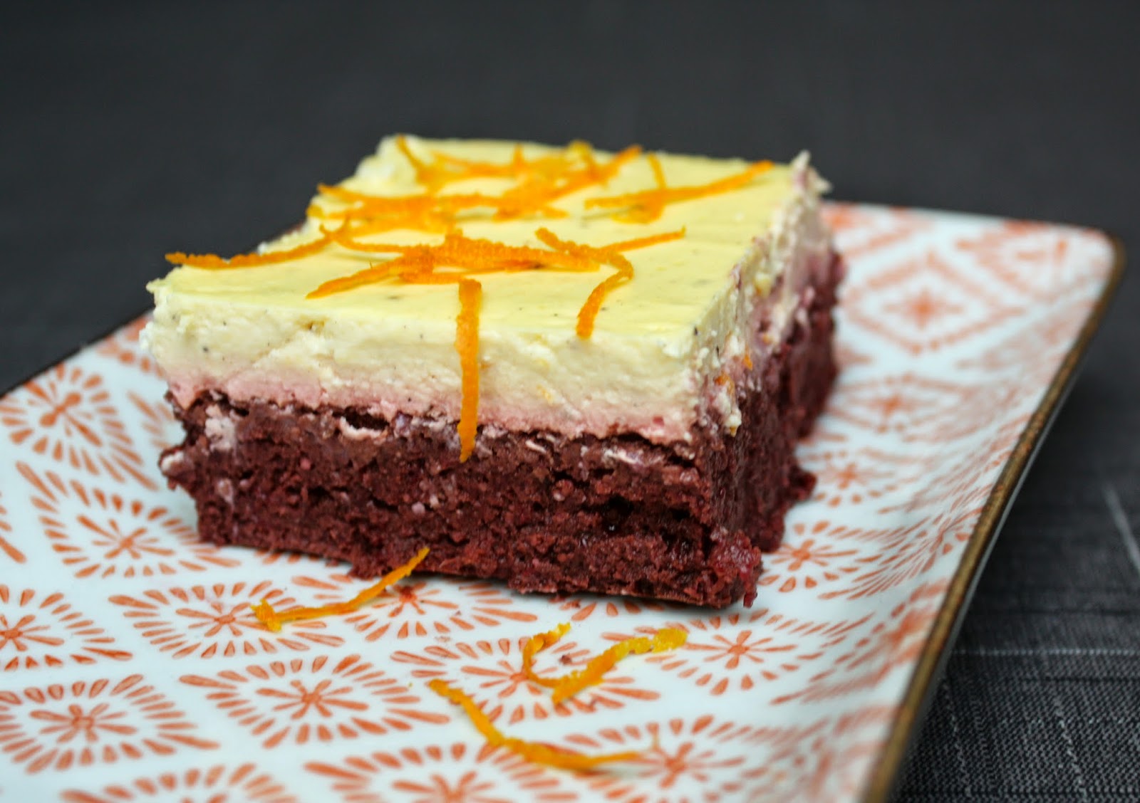 Purér rødbede og æbler og pisk sammen med æg. Rør kakao, husk, pofiber og kokosfibre sammen og smag til med sødemiddel. Hæld dejen ud i et smurt ildfast fad (ca. 15 x 22 cm) og forbag browniebunden 10 minutter ved 200 grader, mens du tilbereder cheesecake-fyldet.